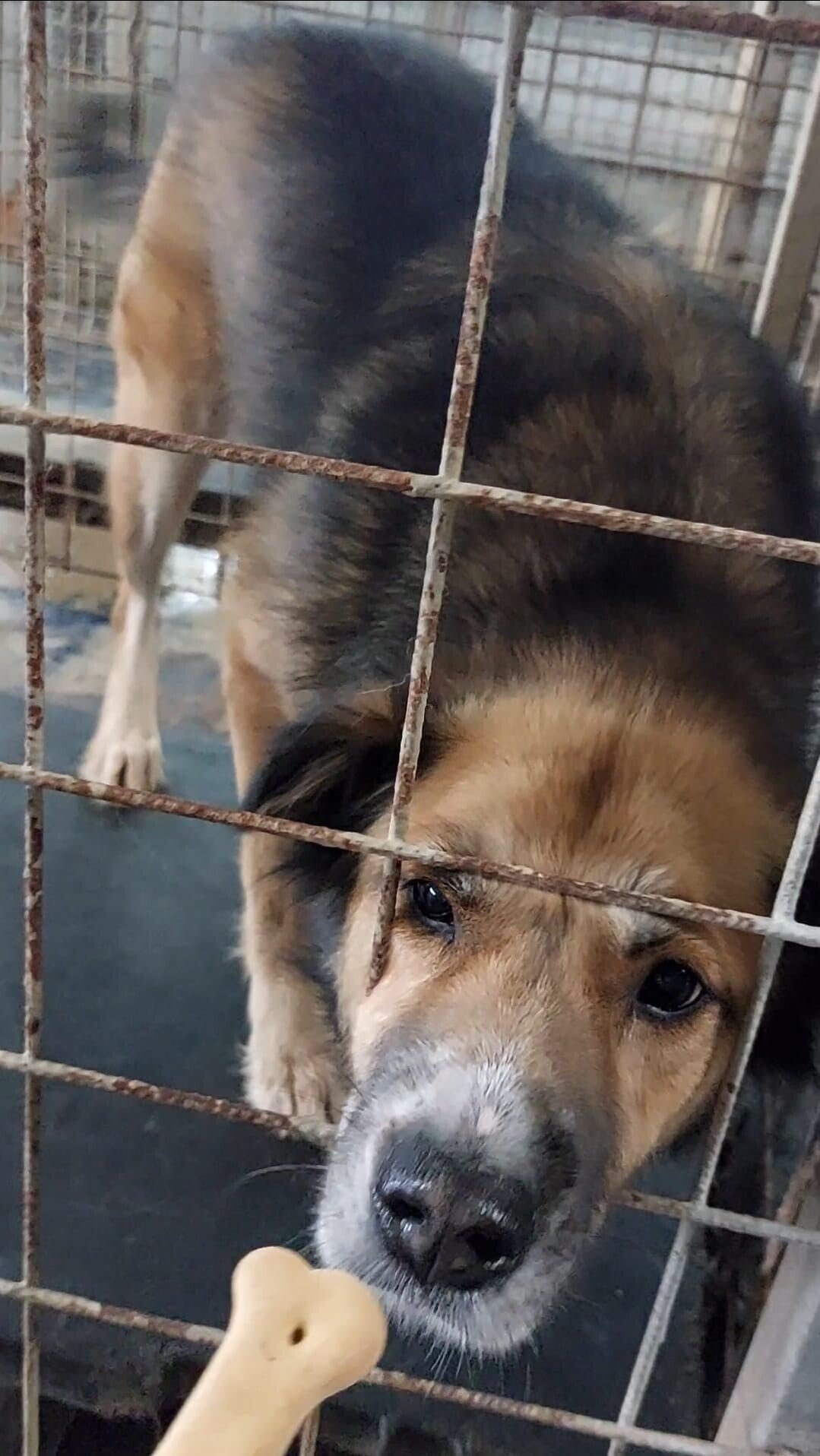 Oh… un regard posé sur moi… et même un biscuit ? Mon cœur bat plus fort. Je m’appelle Benny, matricule #21128. J’ai 5 ans, dont 4 passés derrière les barreaux à attendre. Attendre qu’on me voie. Qu’on me choisisse. Je suis un grand nounours timide, peureux, mais avec le temps, je sens que je vais adorer les câlins.
