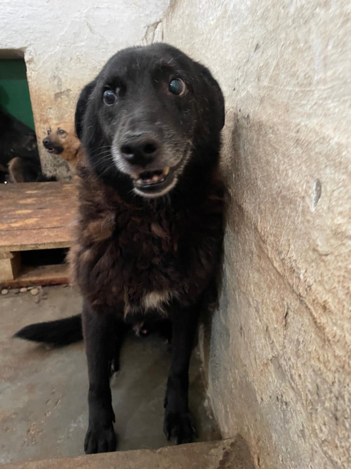 Il vit dans un box sale, sur le béton, entouré d’autres malheureux. Le vacarme, l’odeur, le froid… Et pourtant, il reste doux, calme, incroyablement gentil. Il ne nous en veut même pas.