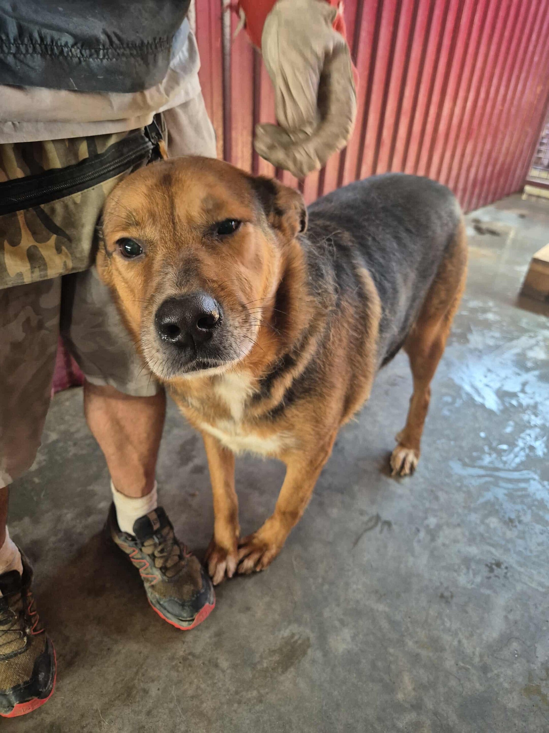 King a surement été abandonné ou a du moins, déjà côtoyé des humains. Il a vécu des années dans un mini box individuel de 2M2 duquel il ne sortait jamais, puis a été déplacé dans un box avec plein d'autres mâles. Il n'est pas réactif et reste très calme dans son box.