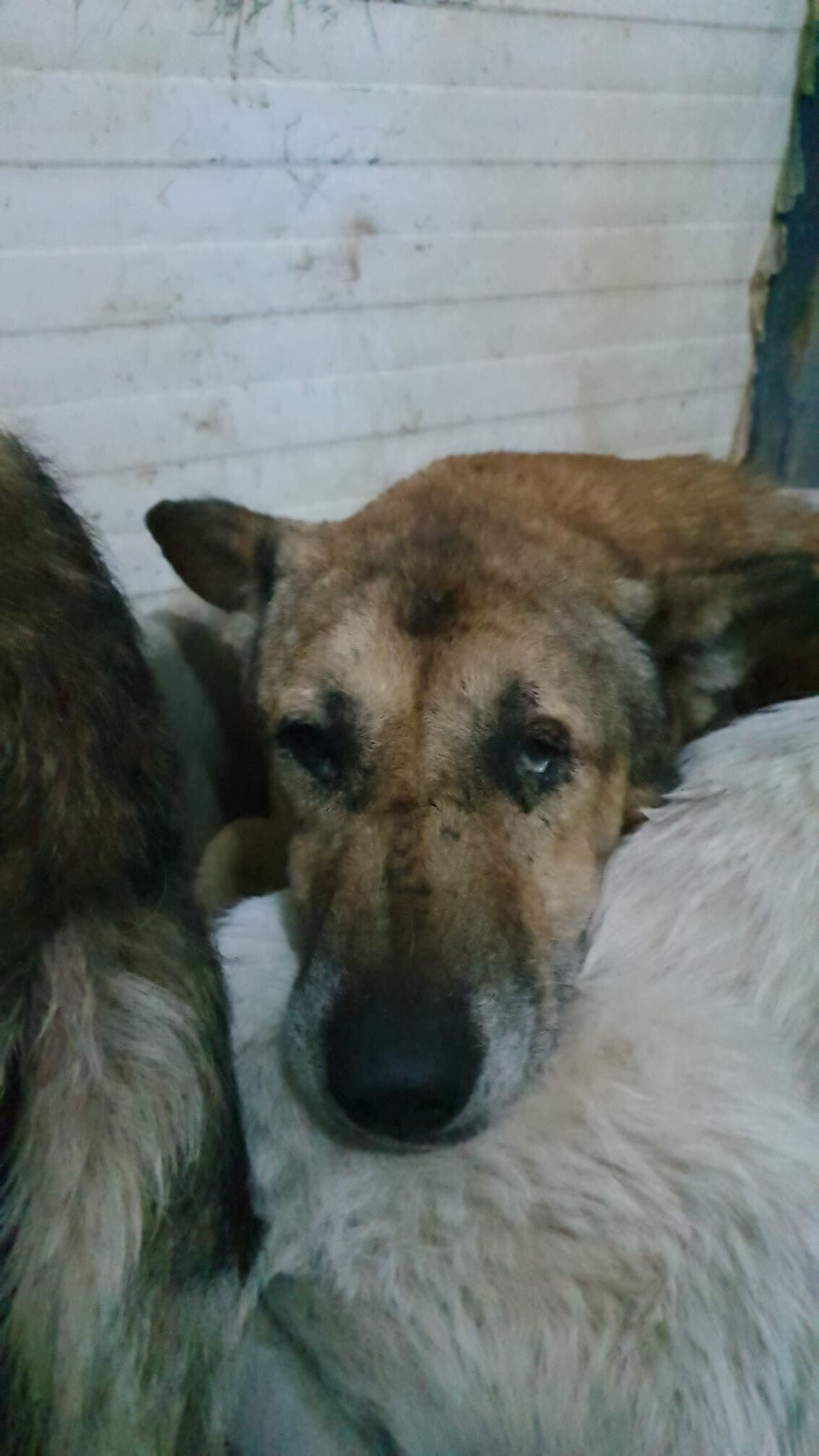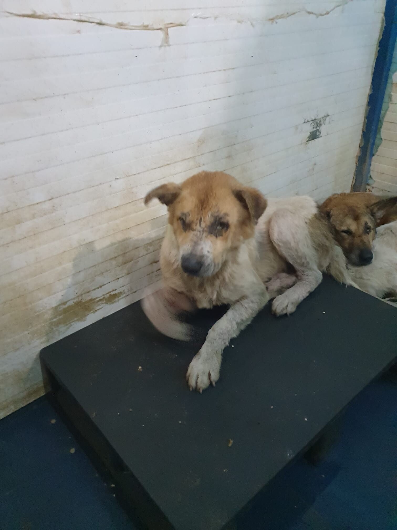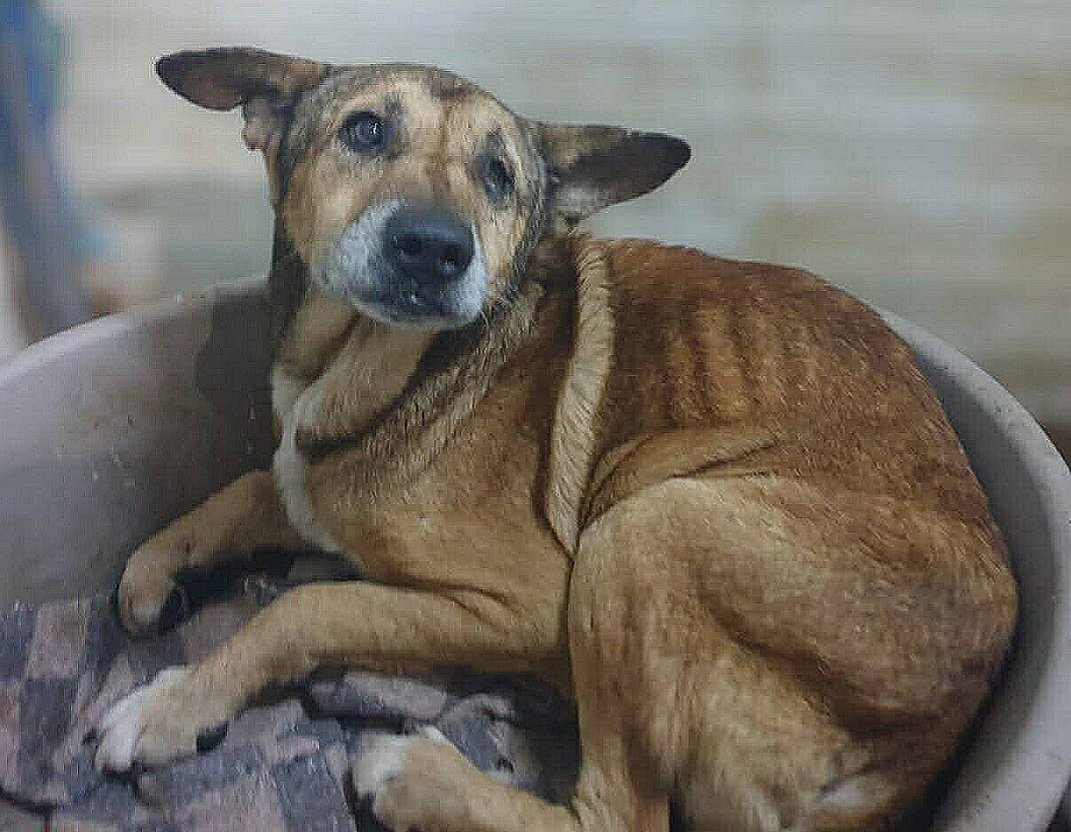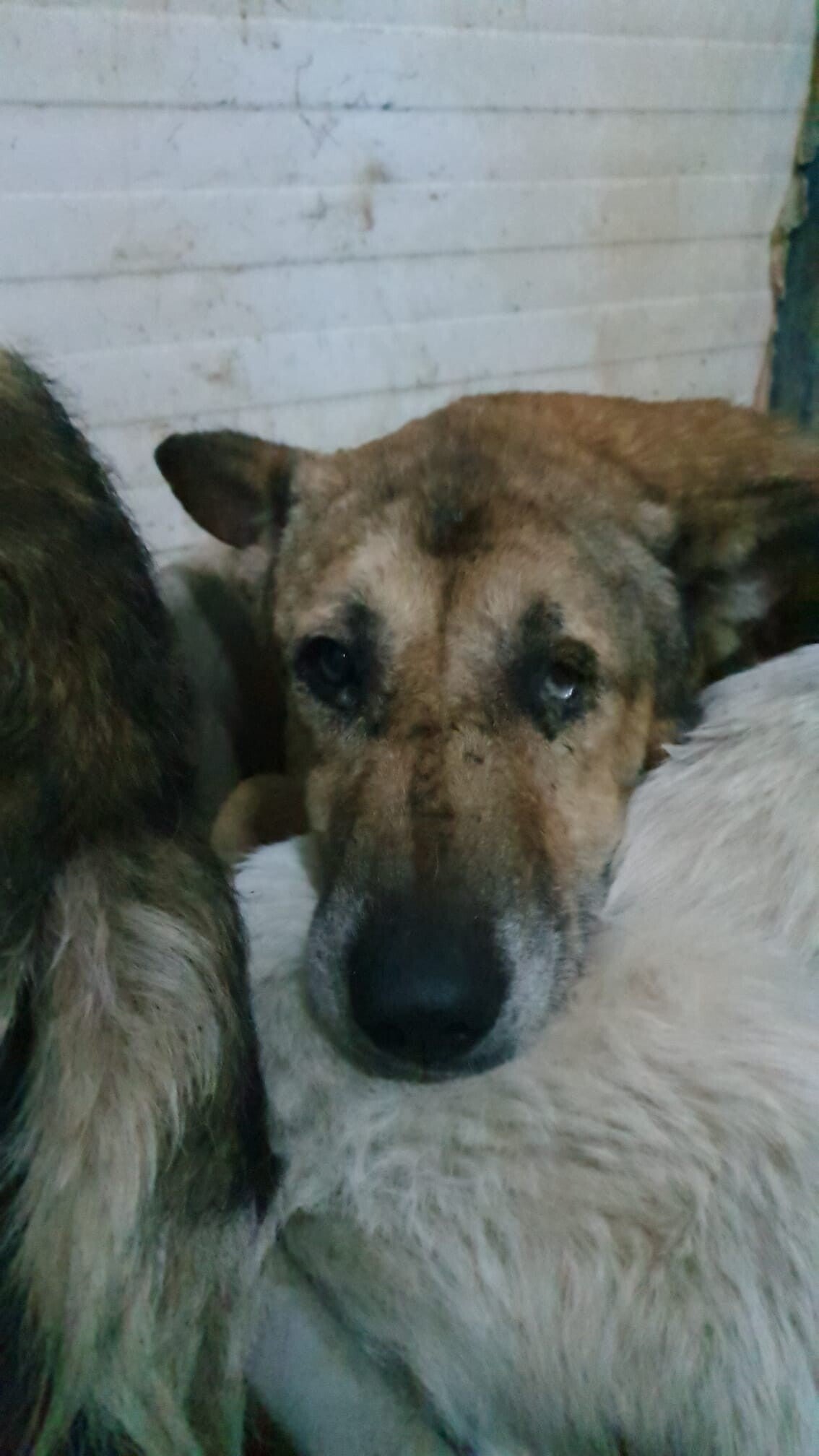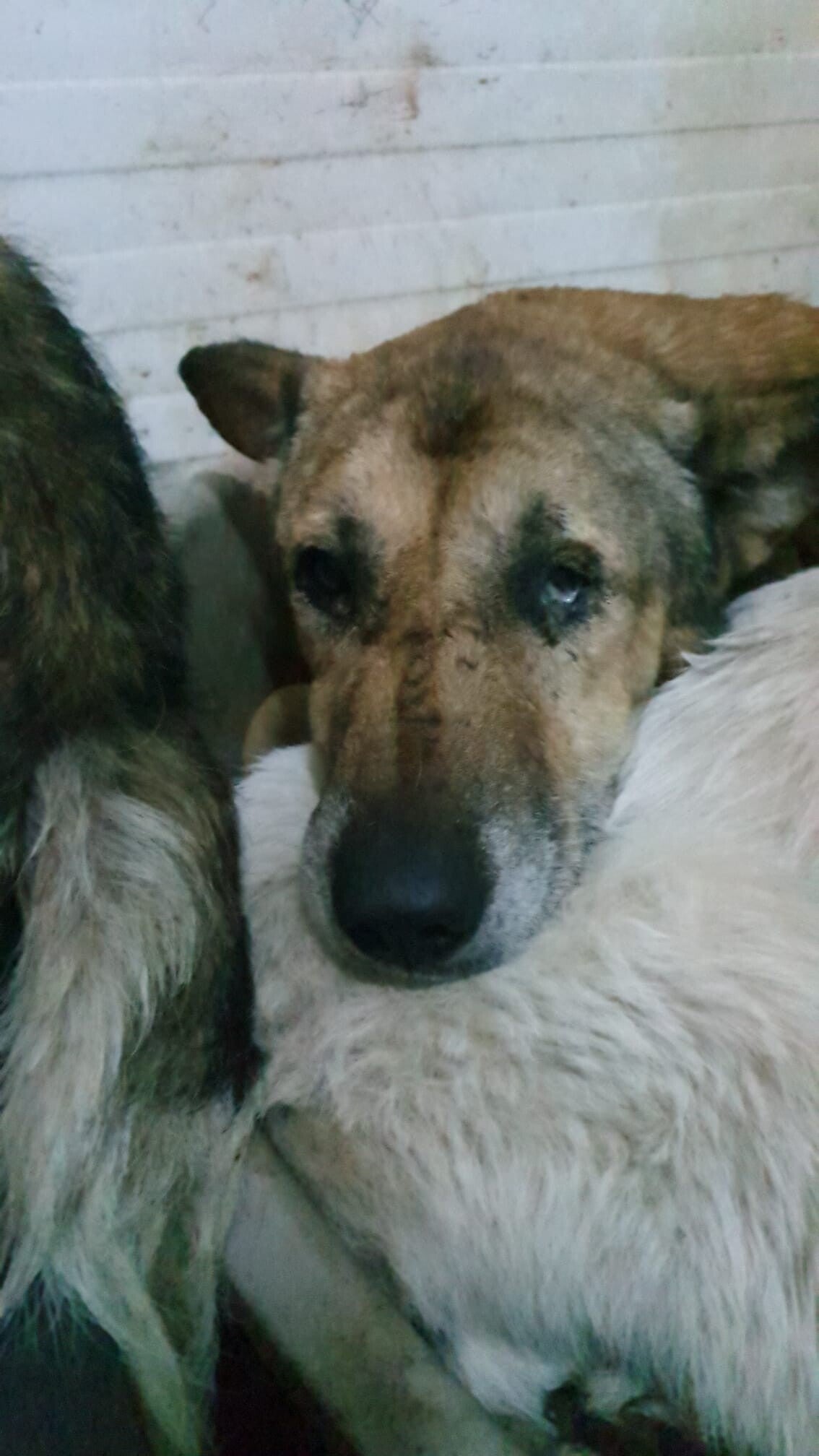 c’est un vieux chien au regard éteint. Il vient d’arriver en fourrière, attrapé sans douceur, traîné jusqu’à une cage froide de 2m² qu’il partage avec deux autres âmes perdues. Depuis, il ne bouge plus, la tête posée sur son compagnon d'infortune. Il ne regarde plus. Il ne croit plus.